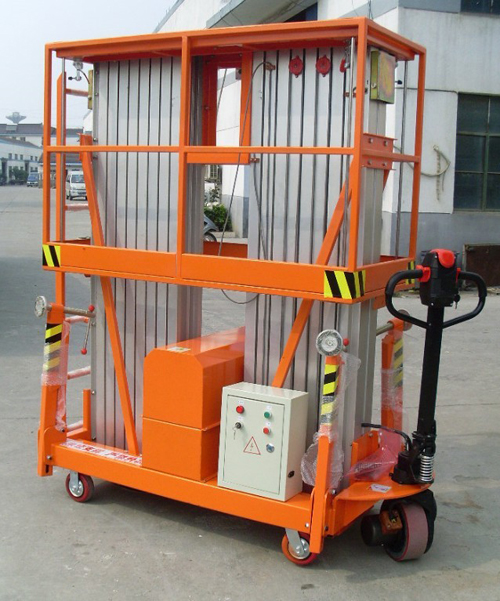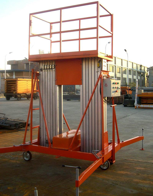 鋁合金液壓升降機(jī)整機(jī)重量輕,機(jī)動性好,適合單人操作;特制的桅柱間導(dǎo)輪裝置,升降平穩(wěn)自如;結(jié)構(gòu)緊湊,運(yùn)輸狀態(tài)尺寸小,可進(jìn)入一般電梯的轎廂以及能順利通過門洞和狹小通道;雙重保護(hù)的支腿結(jié)構(gòu),工作更安全,且可貼近工作面升降作業(yè);根據(jù)使用場所高的要求,可做成手動放到或電動放到式升降平臺。以滿足門口比較低時使鋁合金升降平臺無法進(jìn)入的情況。
